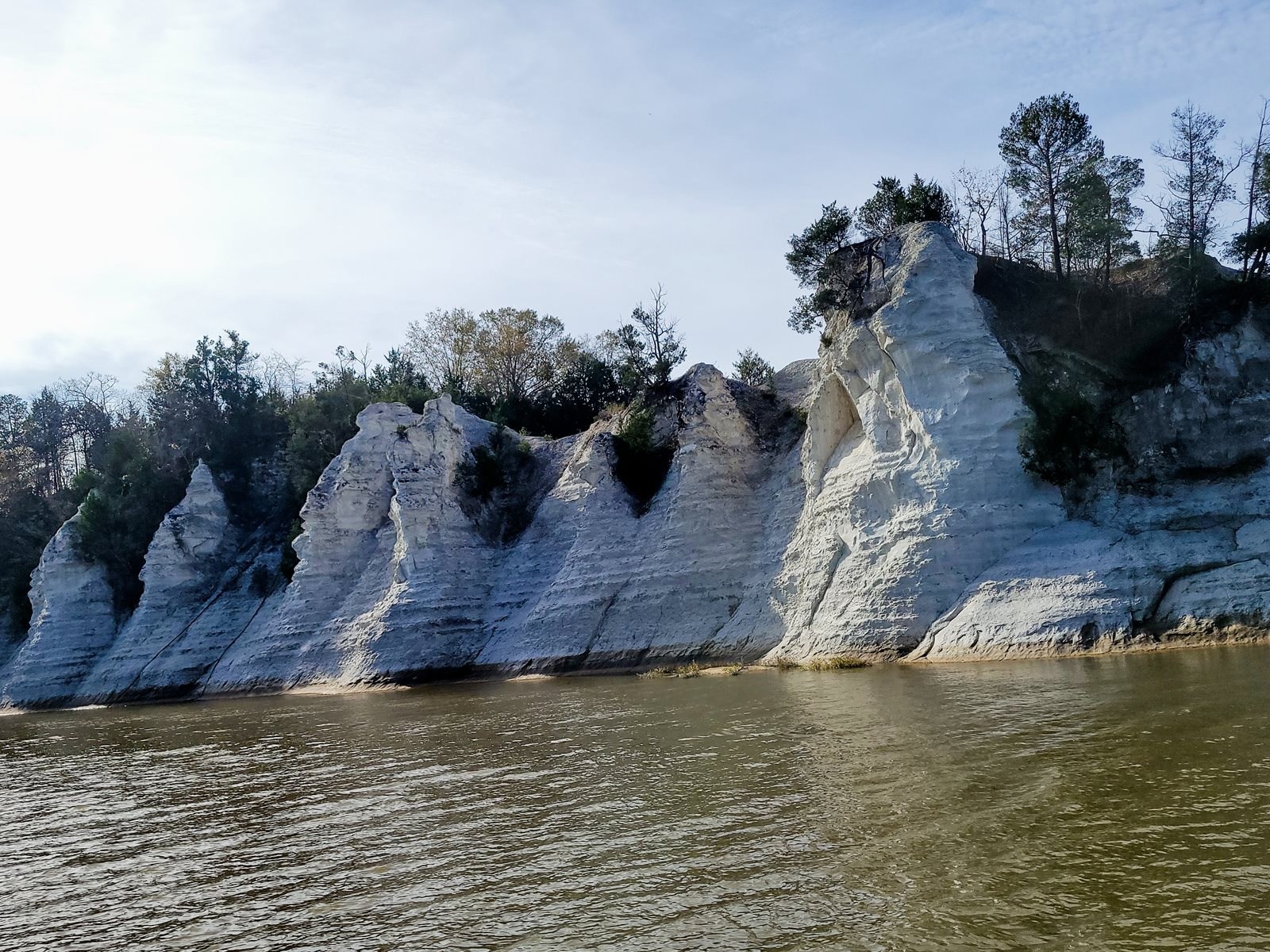 These white cliffs are located on the Tombigbee River at Epes, AL. They are part of the Selma Chalk formations which were deposited at about the same time as England’s famous White Cliffs of Dover. On the state’s western edge, an alabaster memento of central Alabama’s former underwater life rises 50 feet above the Tombigbee River. The White Cliffs of Epes, formed around the same time as their famous Dover cousins, are made up of microscopic algae shells that drifted to the seafloor around 80 million years ago to become a massive chalk formation that spans three states. To give you an idea of the size of these shells, a sugar-cube-sized piece of the chalk contains between 4 and 10 billion shells. The striking, 2-mile stretch in Epes offers visitors gorgeous photo ops and a scenic backdrop for boating. Find the best viewpoint on the bluff side of the Highway 11 bridge or push up your small boat to one of the river’s many popular sandbars along the opposite bank. The cliffs are not open to hikers. Access to these White Bluffs of Epes is very limited to a railroad bridge or being on the waterway.