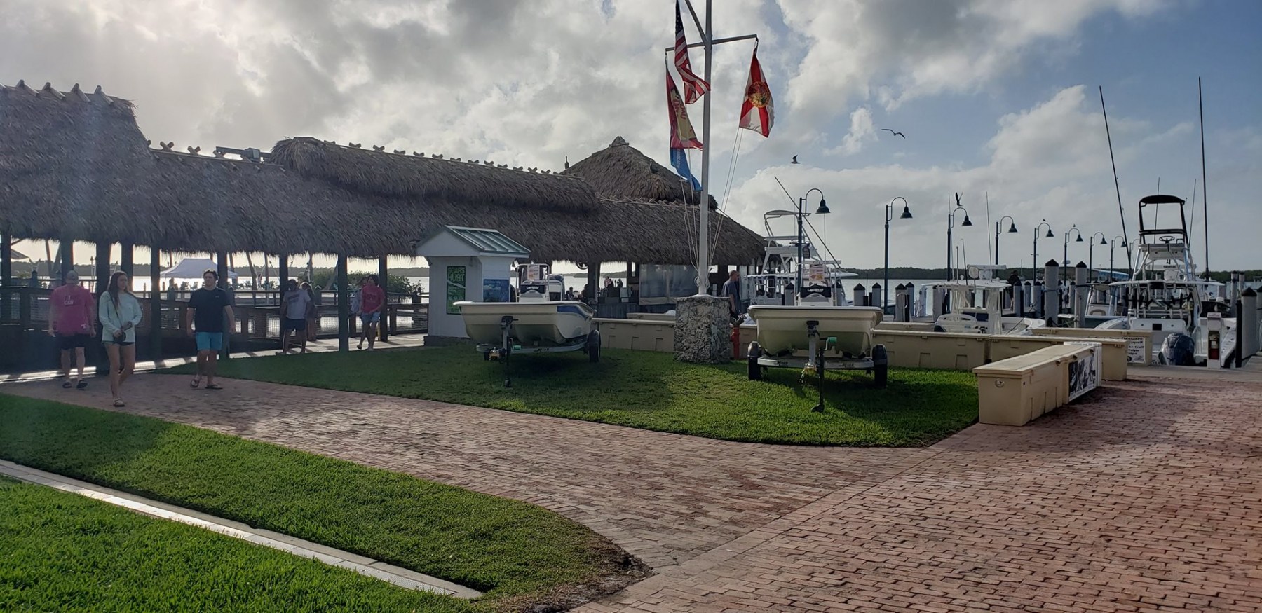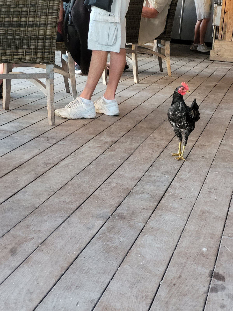 On another day we headed up to Islamorada and stopped at The Bass Pro Shop. Roosters and chickens with their young were everywhere. These Key West roosters live here in The Keys like squirrels do back in our hometown. They are everywhere clucking and doodling in the most random areas. Add that to the iquanas, pelicans, seabirds and water critters too. Here in this Bass Pro there is a restaurant and bar, as well as feeding the Tarpon. Tarpon are large 100 lb plus fish with mouths on the top of their heads. They stare at you looking for food and can make a suction sound when getting the shrimp you buy to feed them. No, they are not interested in your french fries from the table. After having a really good marguerita, feeding tarpons and wandering the store we stop for dinner on the waterfront patio. Food is okay but not great. We rarely eat out so this is a treat any way you look at it. It was so windy at the boat and it is sheltered here.